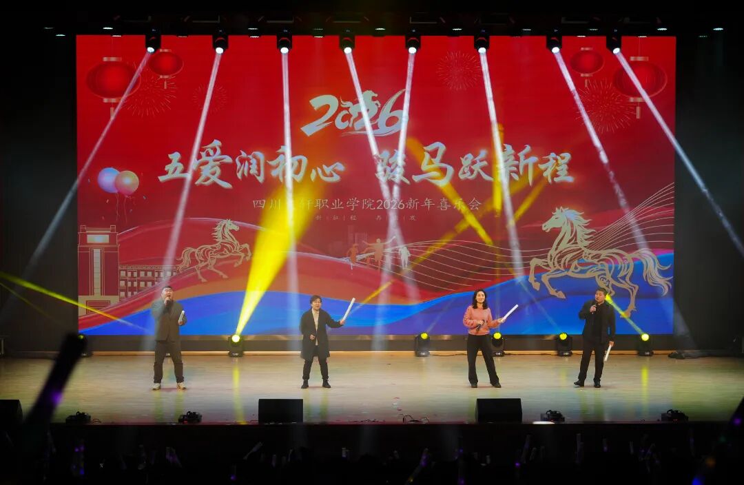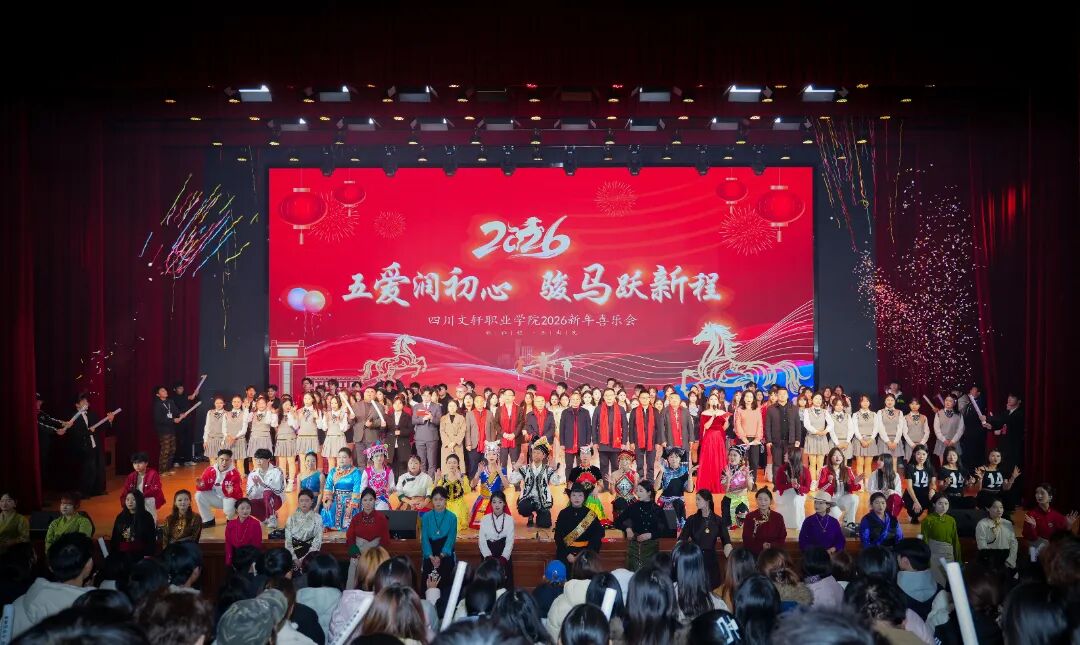 辞旧迎新凝合力,砥砺奋进启新程。为全面总结 2025 年办学成果,营造喜庆祥和的节日氛围,进一步激发全校师生干事创业的昂扬斗志,2025 年 12 月 29 日至 30 日,四川文轩职业学院以 “五爱润初心,骏马跃新程” 为主题的 2026 新年喜乐会在成都、遂宁两校区先后隆重举行。学校领导班子成员、各二级学院及职能部门负责人与全校师生齐聚一堂,共赏精彩演出,共话发展蓝图,共同迎接 2026 马年新春的到来。