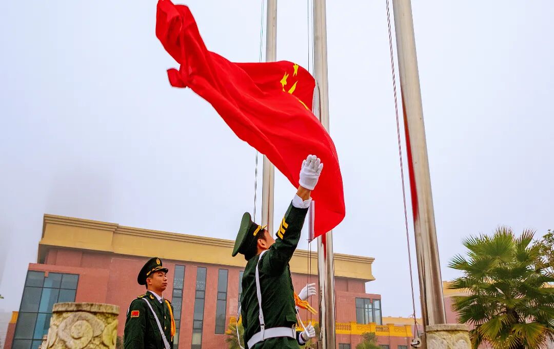 迎着清晨的朝阳,国旗护卫队队员迈着铿锵有力的步伐,护送五星红旗缓缓入场。伴随着雄壮激昂的《义勇军进行曲》,鲜艳的五星红旗冉冉升起、迎风飘扬。全体人员肃立注目,高唱国歌,向国旗致以最崇高的敬意,深切缅怀90年前为民族独立和国家尊严挺身而出的爱国青年。